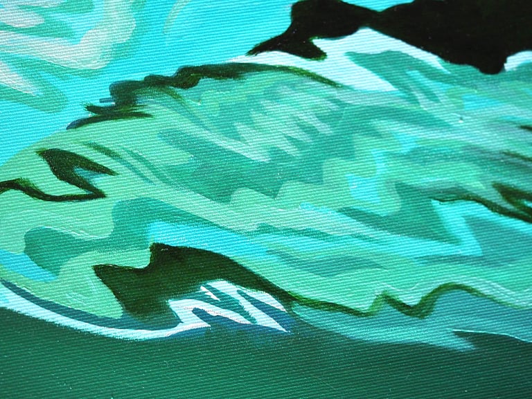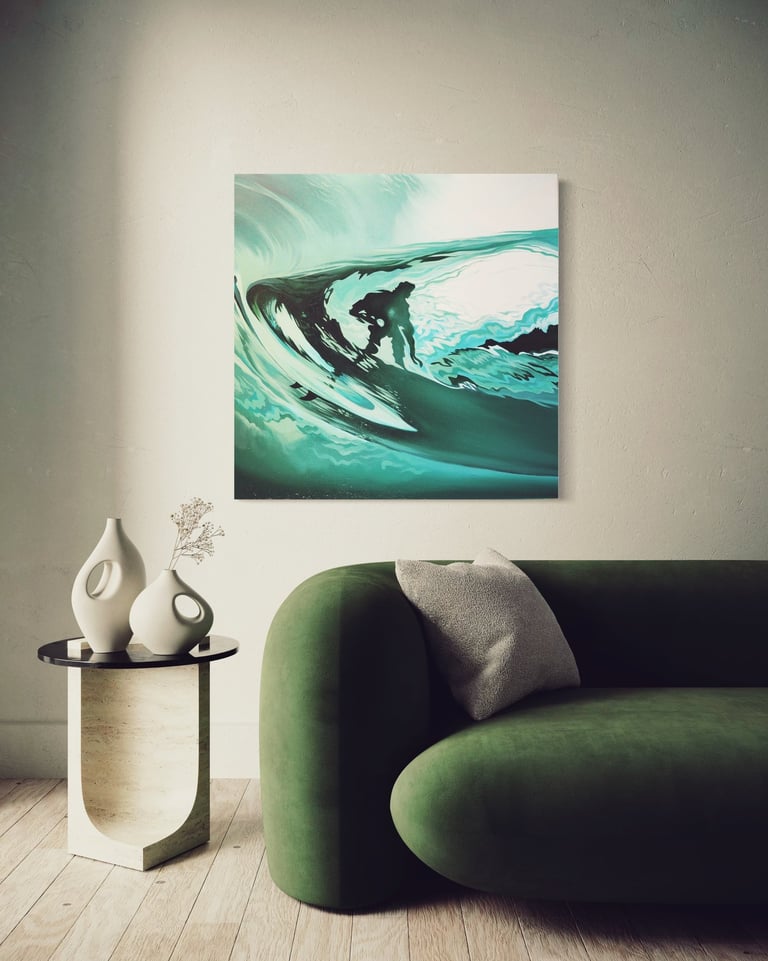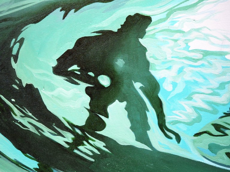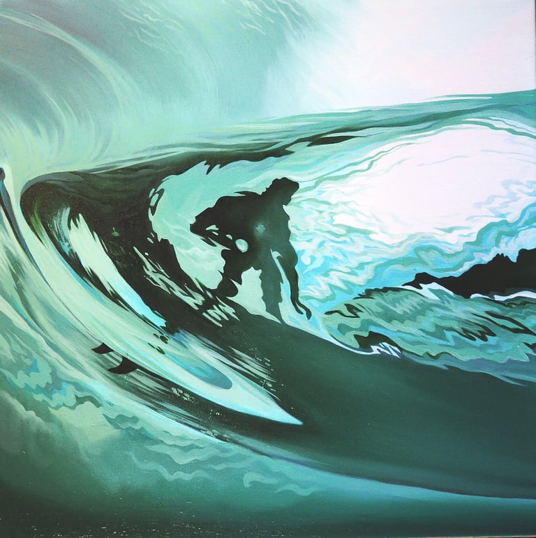 Peinture acrylique et huile 80x80 cm Ca faisait longtemps que je voulais peindre cette vue magique d'un barrel vue de l'eau. J'aimerais remercier Charlie Cullen de m'avoir permis d'utiliser sa photo comme source d'inspiration pour ce tableau. Toujours dans la même série monochrome, j'espère que cette nouvelle tendance vous plaira !